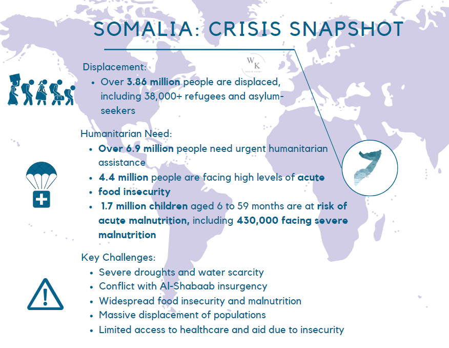 Somalia’s humanitarian crisis is driven by a combination of conflict and climate change, making it one of the most severe emergencies in 2024. The country is experiencing its worst drought in 40 years, which the Minister of Health has described as the most severe and prolonged drought in Somalia’s history. As the drought continues, livestock has died, crops have failed, and water sources have dried up, leaving 8.3 million people in urgent need of humanitarian aid. The situation is further worsened by the Al-Shabaab insurgency, which continues to destabilize large regions of the country. Al-Shabaab’s control over key areas obstructs the delivery of much-needed aid, placing millions at risk. In early 2024, the group displaced over 25,000 people, contributing to a broader displacement crisis, which now includes 3.8 million internally displaced persons.