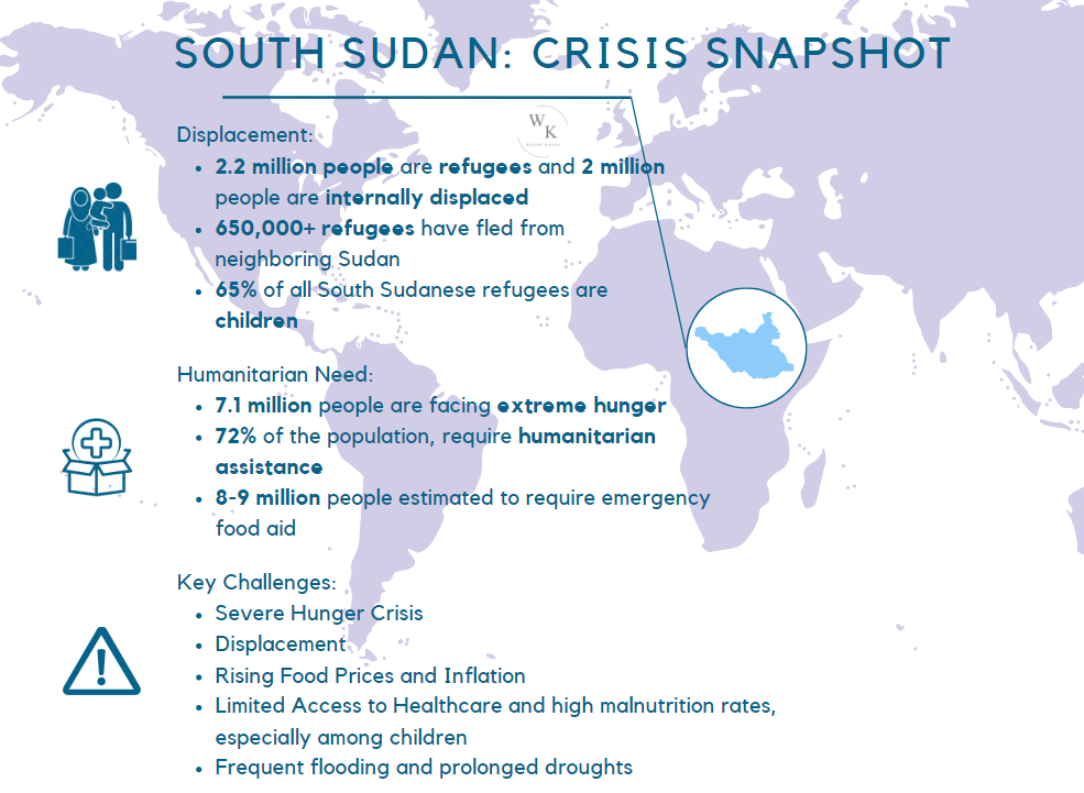 South Sudan is on the crisis watch of many international humanitarian organizations due to the current environmental situation and the spillover effects of the war in neighboring Sudan. More than 7.1 million people are facing extreme hunger, exacerbated by continuous flooding, drought, and economic instability. The recent influx of over 650,000 refugees fleeing the conflict in Sudan has placed additional pressure on South Sudan’s already overstretched resources. With many areas submerged due to recurrent floods and others suffering from drought, farmers can no longer produce sufficient food, pushing millions closer to famine.